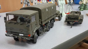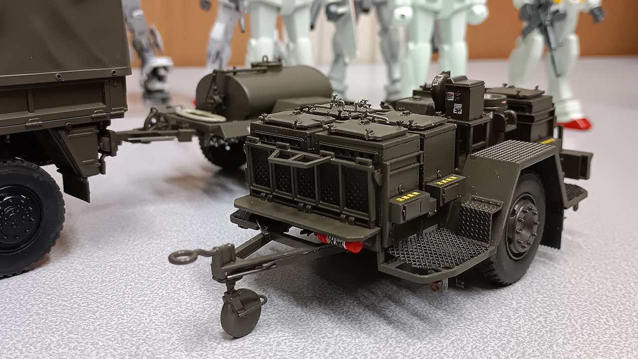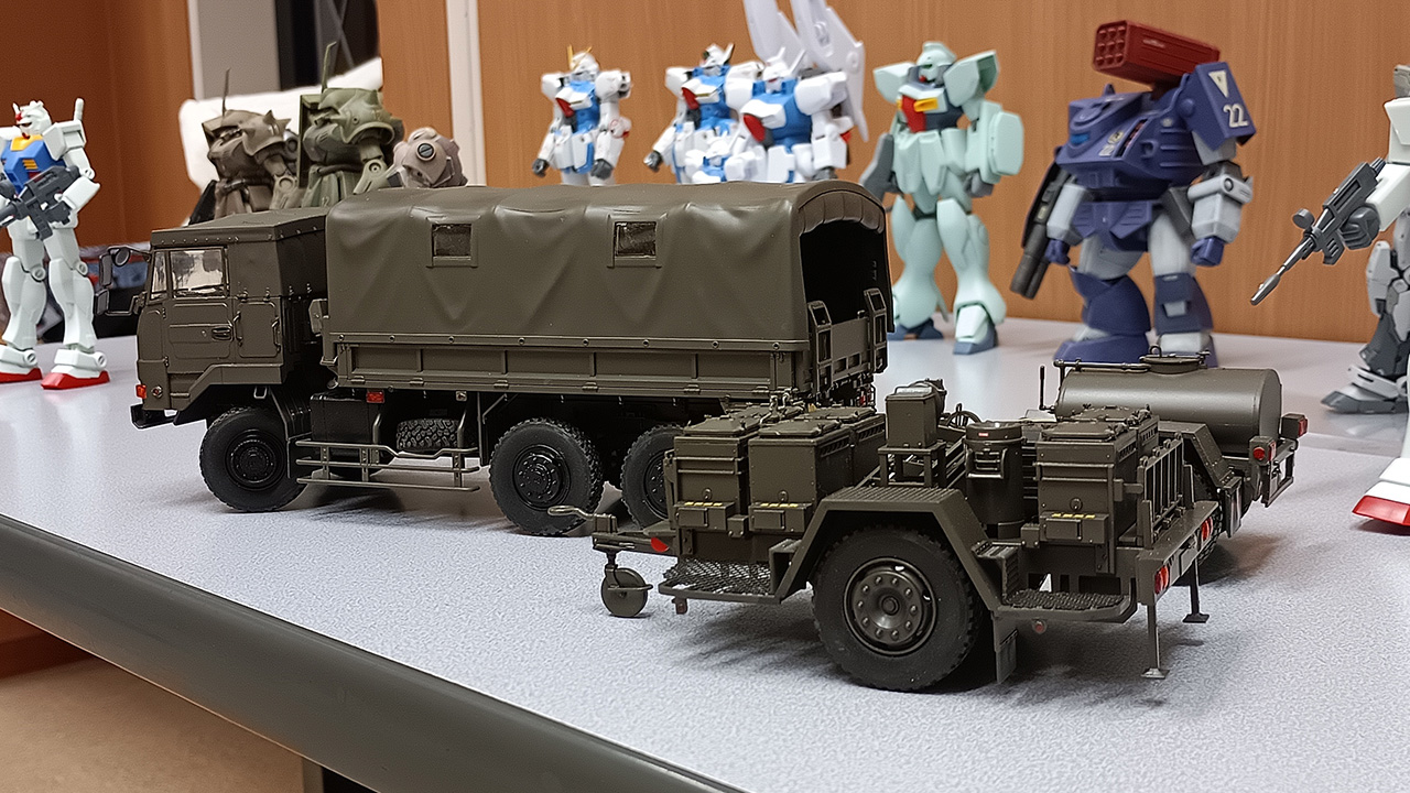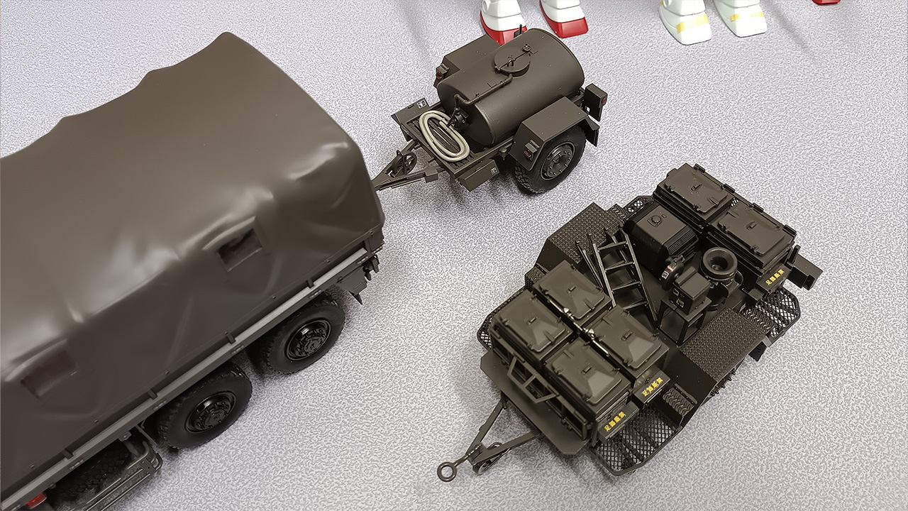 アオシマの1/35 3 1/2tトラック(SKW-476) w/野外炊具1号(22改)&1t水タンクトレーラ。