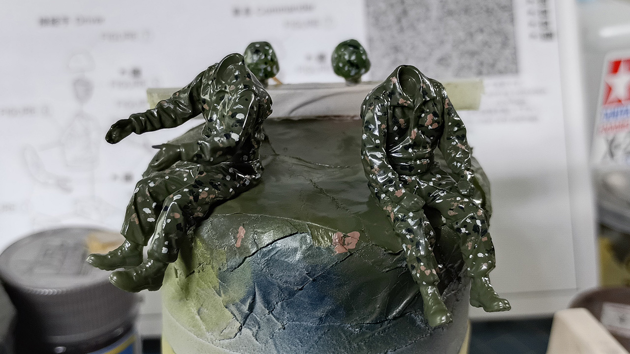 隊員のフィギュアを塗る。ダークグリーンをエアブラシで吹いてから、セールカラー/ウッドブラウン/カウリング色を面相筆で点々と塗っていく1巡目。