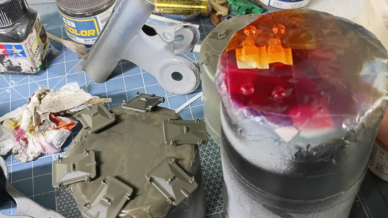 透明部品とフタを塗装。フタにネジを取り付けるのが超絶めんどくさかった。