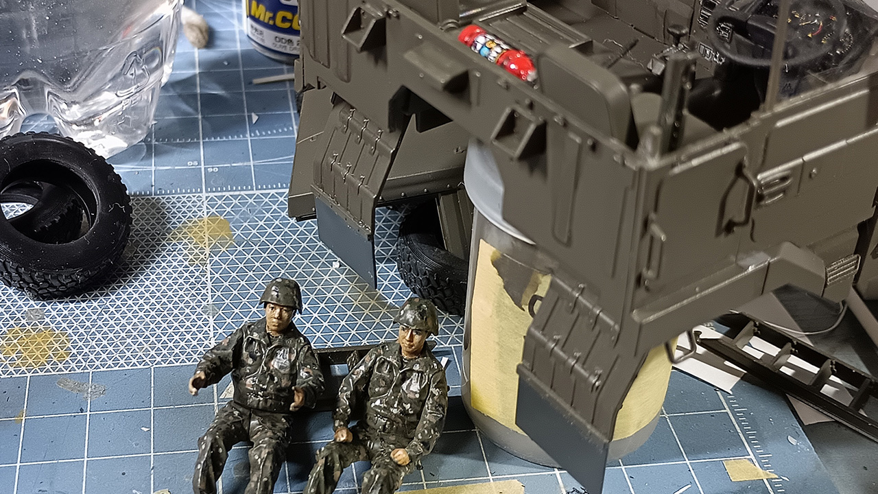 キャブも仕上げる。あちこち細部を塗ってサイドミラーとマットガードと消化器をつける。