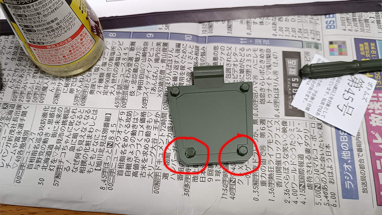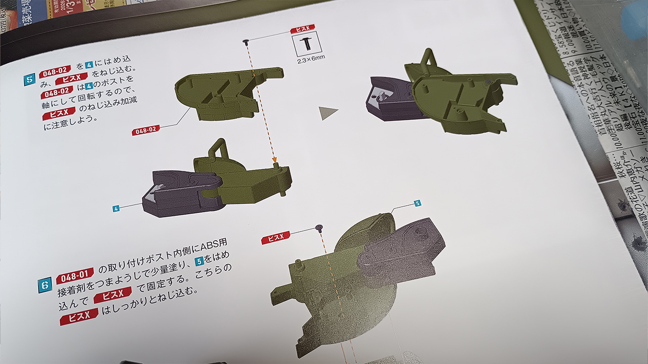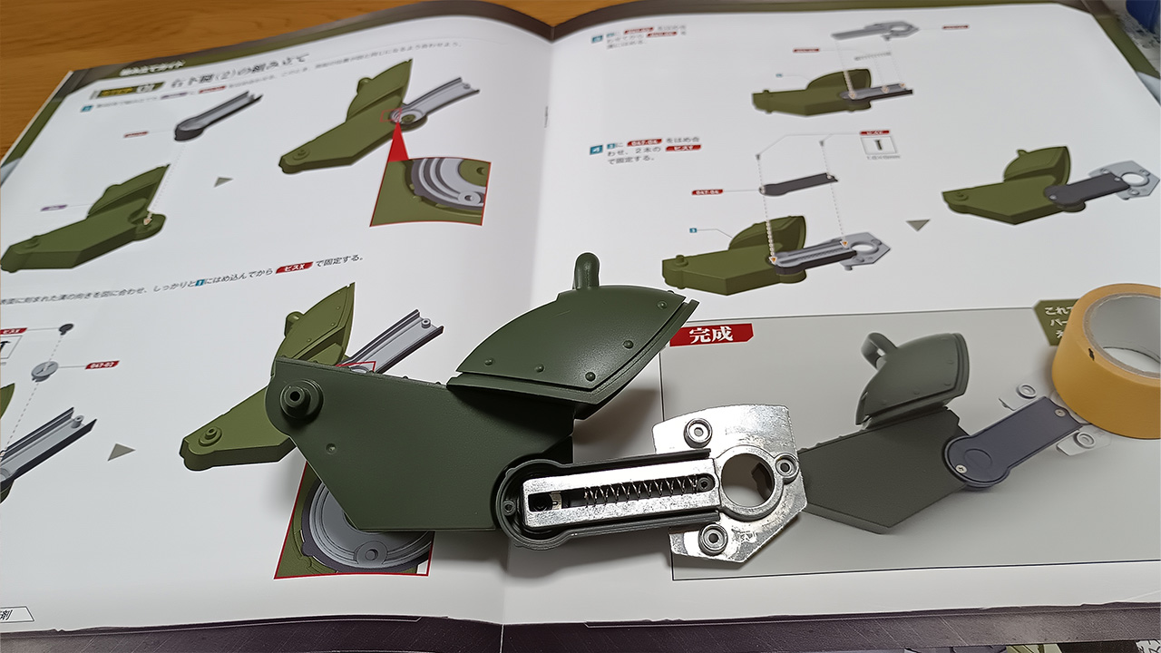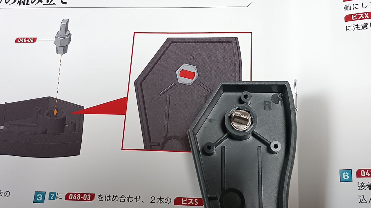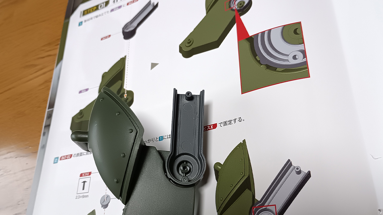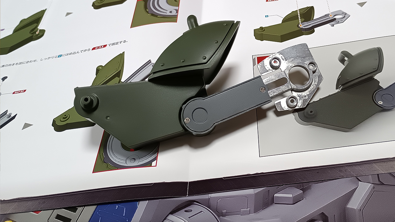 前号の膝関節部分に被せるガワのパーツに金属部品を取り付ける。角度を間違わないようにしよう。